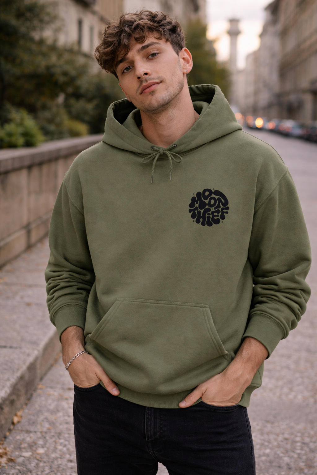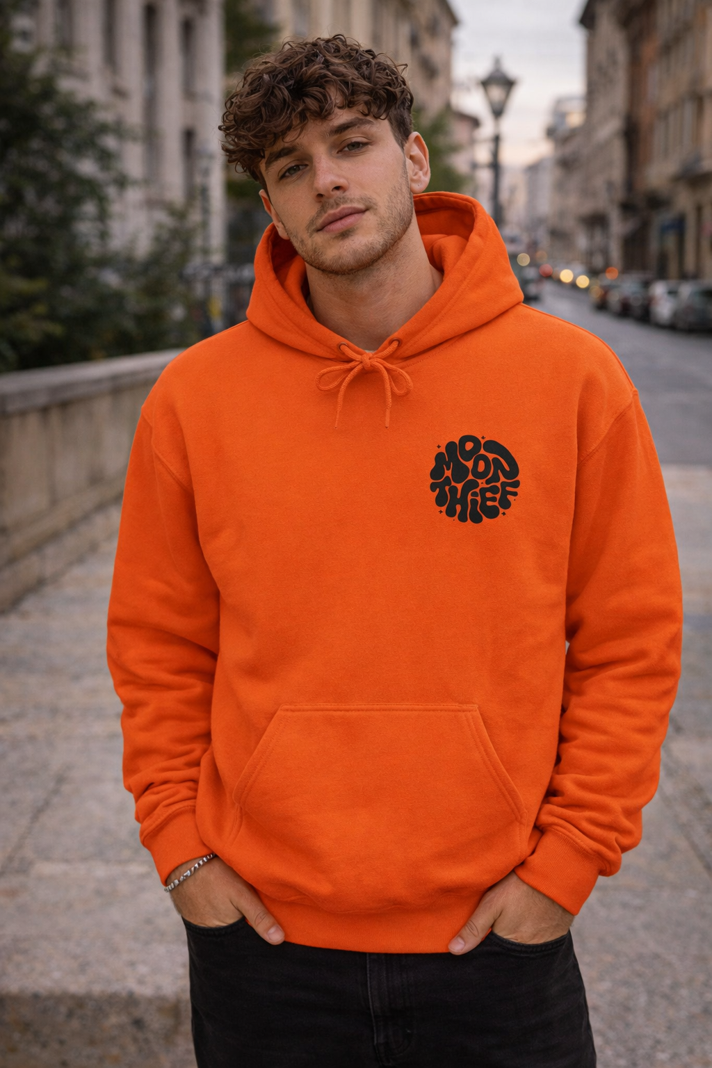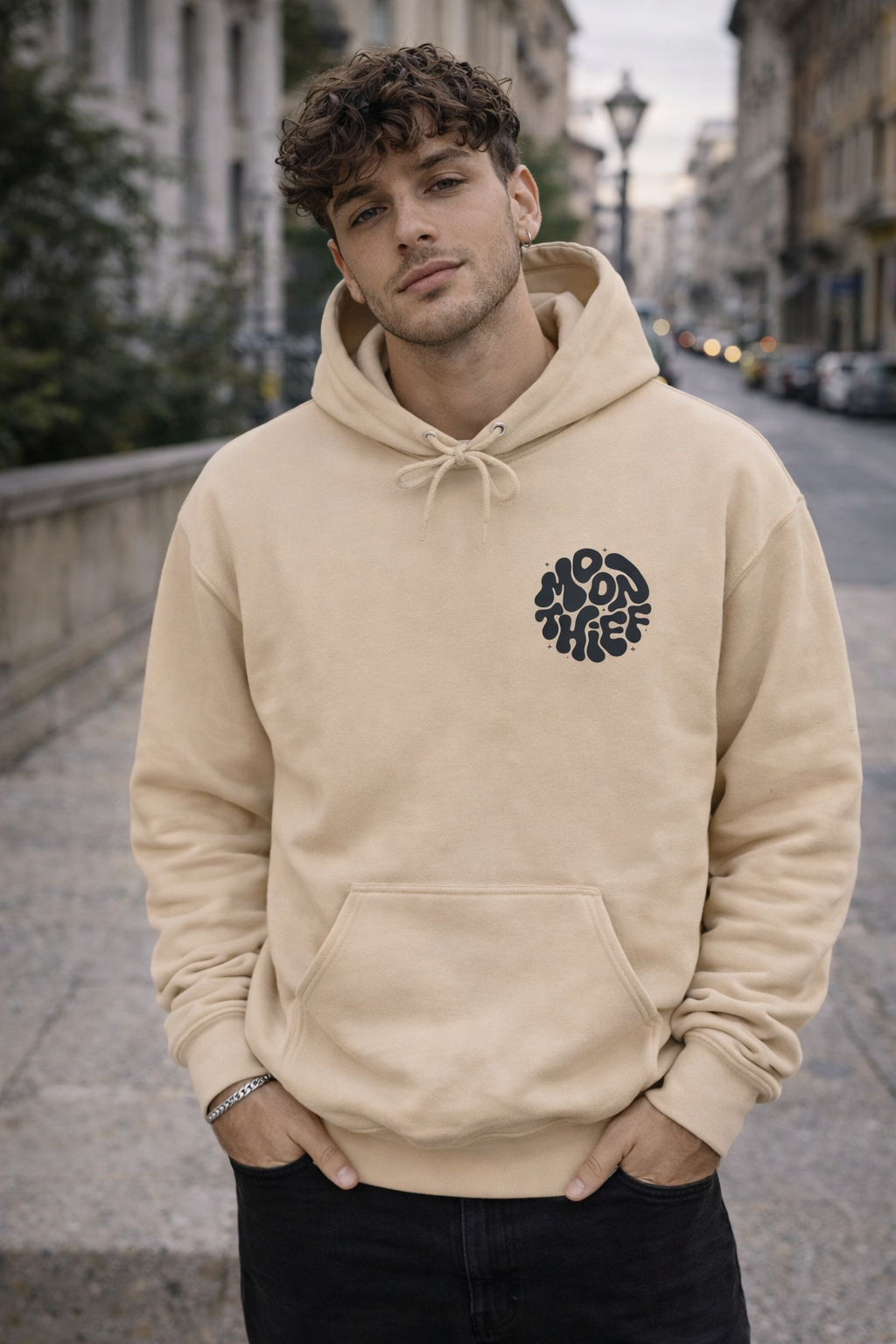 A soft, mid-weight hoodie that feels like a warm exhale after a long day. The front wears a small, hand-drawn emblem while the back carries a bold, organic graphic that reads like liquid ink — modern but rooted in analog vibes. The double-lined hood and color-matched drawcord give structure; the roomy kangaroo pocket keeps hands warm and things close. Wear it when you want something comfortable that still reads intentional: late-night drives, band practice, open-mic nights, or cool mornings chasing coffee and vinyl crates.