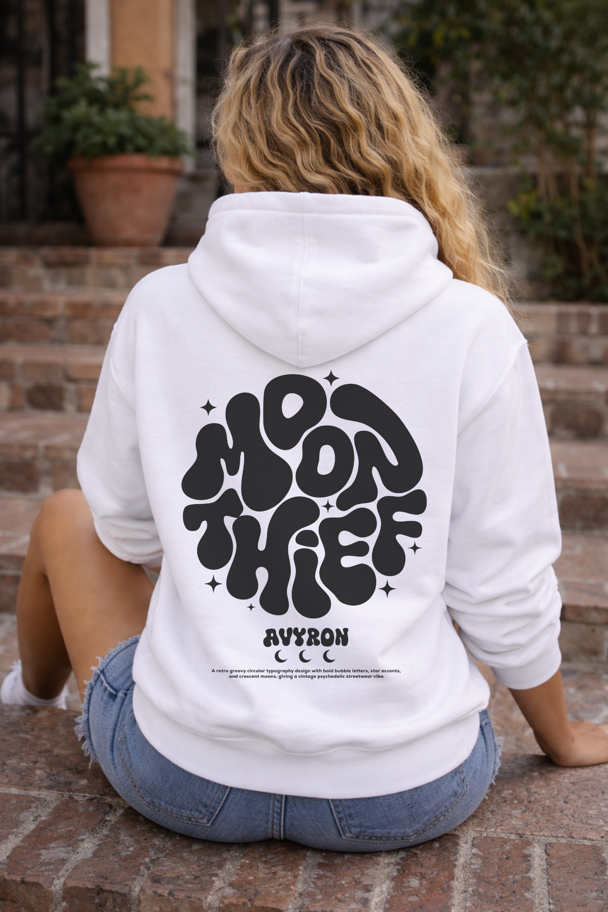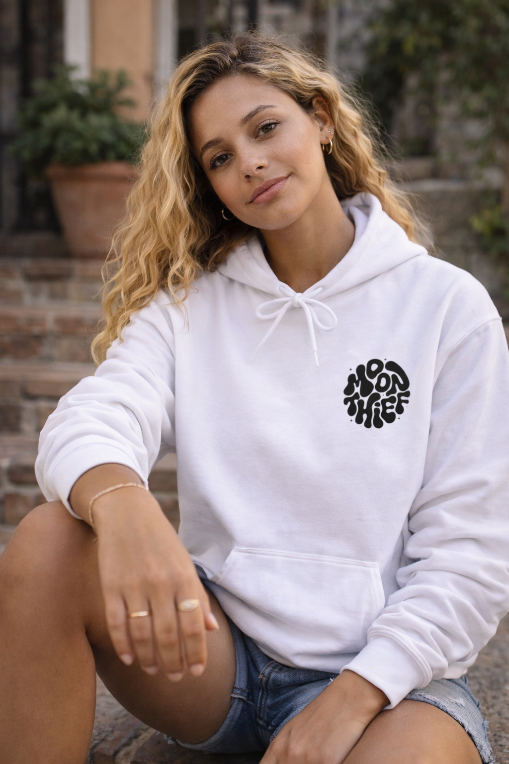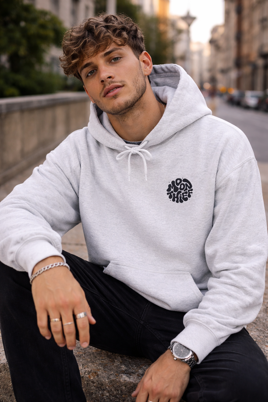 A soft, mid-weight hoodie that feels like a warm exhale after a long day. The front wears a small, hand-drawn emblem while the back carries a bold, organic graphic that reads like liquid ink — modern but rooted in analog vibes. The double-lined hood and color-matched drawcord give structure; the roomy kangaroo pocket keeps hands warm and things close. Wear it when you want something comfortable that still reads intentional: late-night drives, band practice, open-mic nights, or cool mornings chasing coffee and vinyl crates.